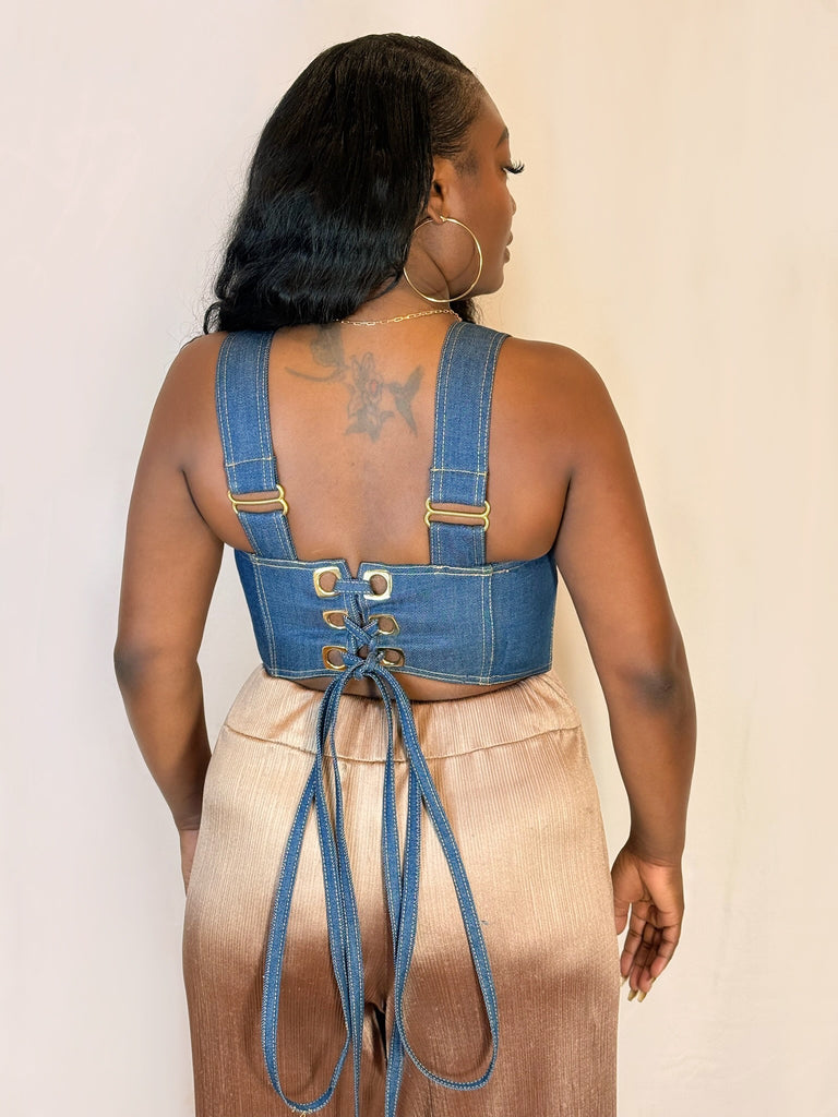 The Denim Jelita 2.0 Corset is a bold twist on classic style, featuring a flattering sweetheart neckline and embossed natural brass hardware for a touch of luxe.  She has 2” straps! Made from high-quality 100% cotton denim & vegan leather this corset is a must-have for adding structure and edge to any wardrobe and she is a 2 in one with the reversibility. Perfect for day-to-night wear, this corset will pair beautifully with skirts, trousers, or your favorite high-waisted jeans.